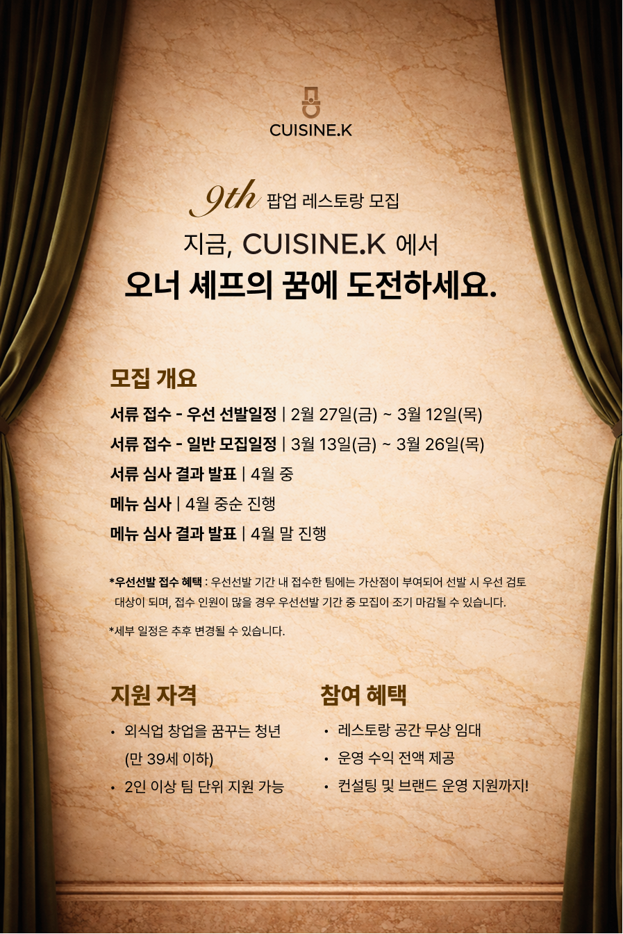 컨텐츠 정보 본문 <지원서를 제출하기 위해서는 Cuisine.K Project 홈페이지 회원가입이 필요합니다.> 지원서 제출하기 관련자료 모집 공고 1. Cuisine.K Project Pop-up Restaurant 지원 안내문_2026.02.docx 파일크기 (80.8K) 지원서 양식 다운 2. Cuisine.K Project Pop-up Restaurant 지원 신청서 및 사업계획서_2026.02.docx 파일크기 (34.6K) 이용 동의서 다운 3. Cuisine.K Project Pop-up Restaurant 지원자 개인정보 수집 및 이용 동의서 팀원 전원 제출 必_2026.02.docx 파일크기 (30.4K)